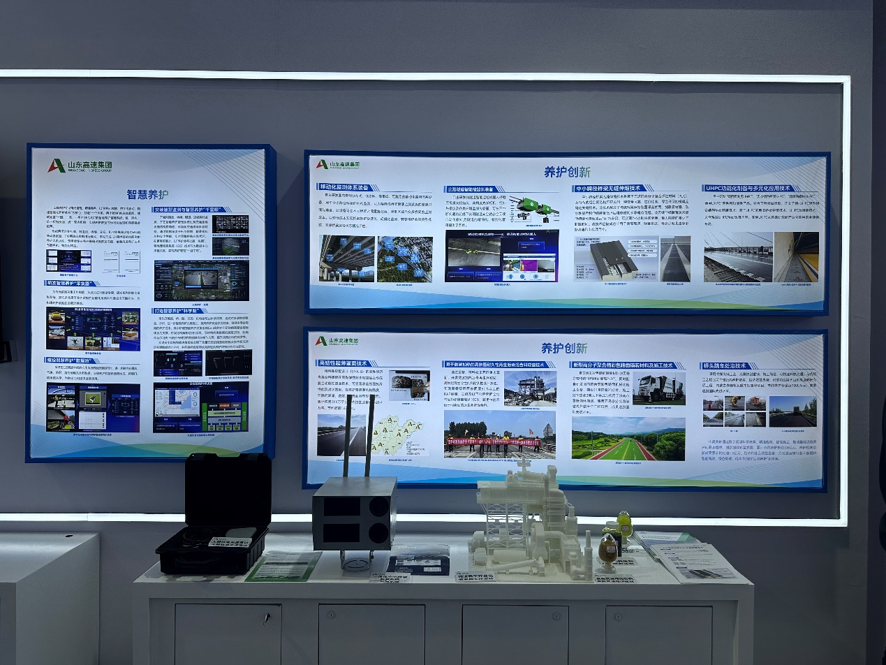大會期間,公司在山東高速集團“智慧養護”板塊分別展示了山東高速基礎設施智慧監測與運維大數據平臺、移動化監測體系裝備、隧道智能巡檢機器人、UHPC成套制備及應用技術、基于微波加熱的高摻量耐久性再生瀝青混合料成套技術、中小跨徑橋梁PUC材料無縫伸縮縫技術等先進四新技術成果,吸引了相關領導、學者以及展商的駐足詢問,公司科研人員圍繞技術特點、產品參數、應用場景和效果進行了詳細介紹,受到了與會人員的一致好評和高度贊賞。